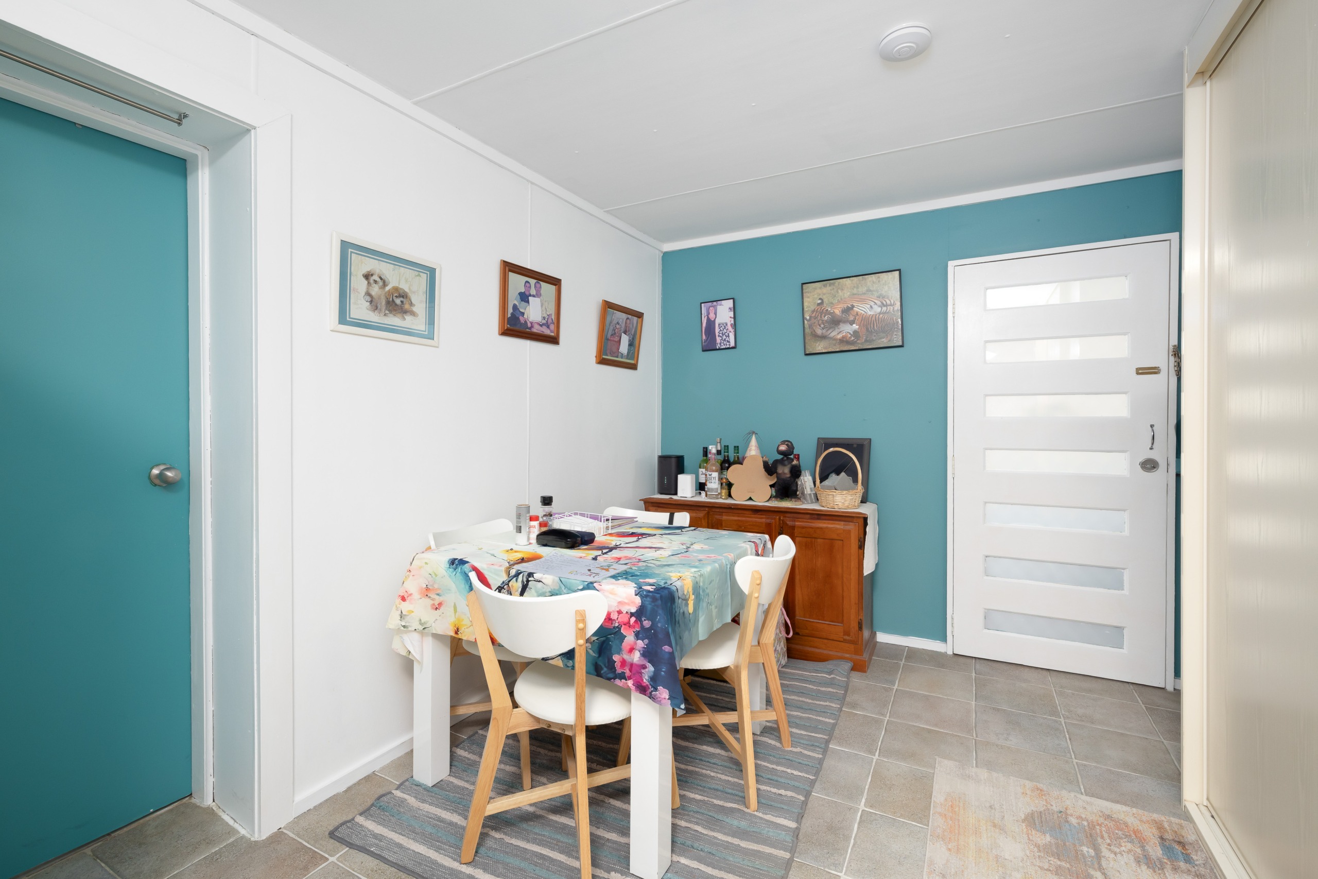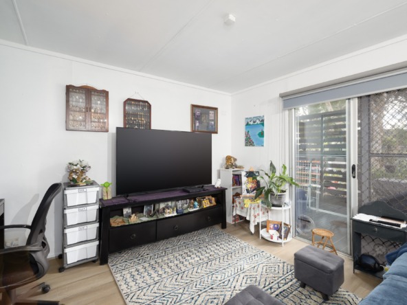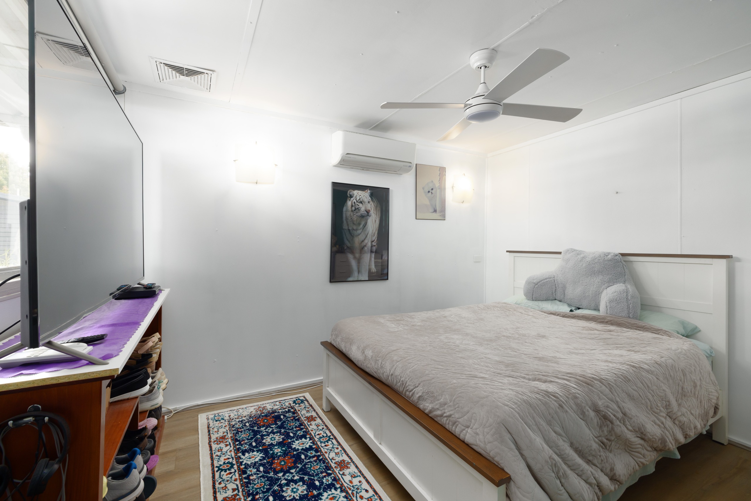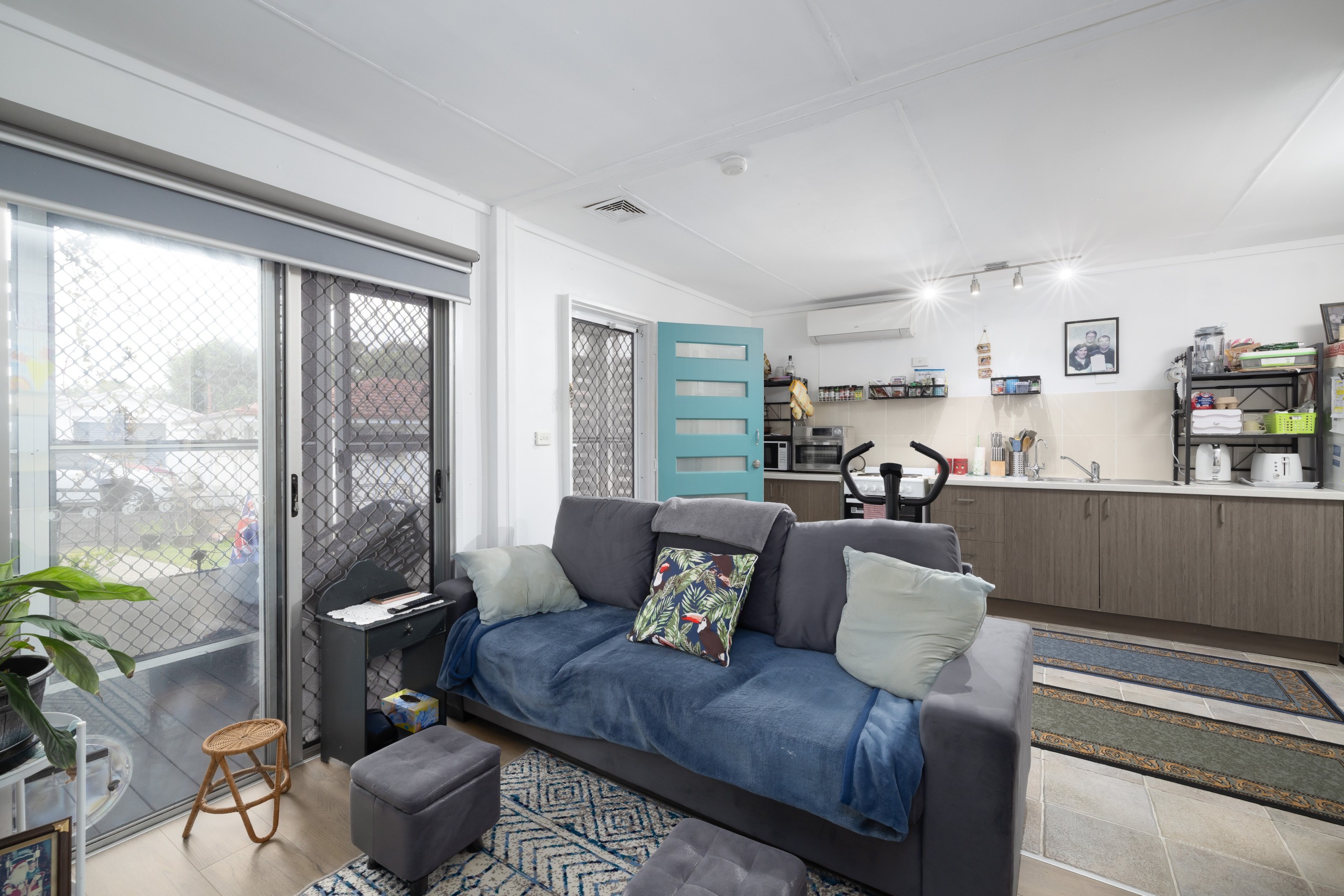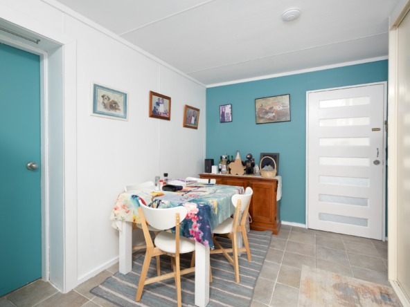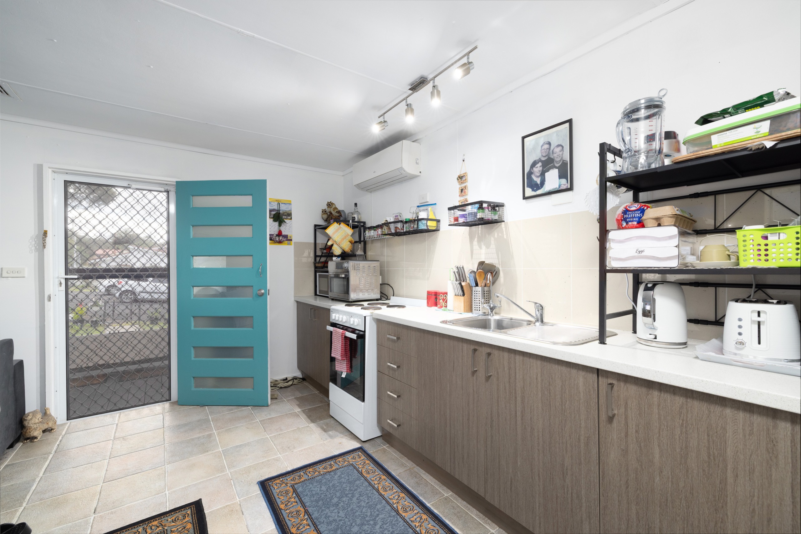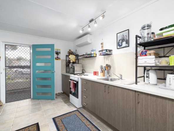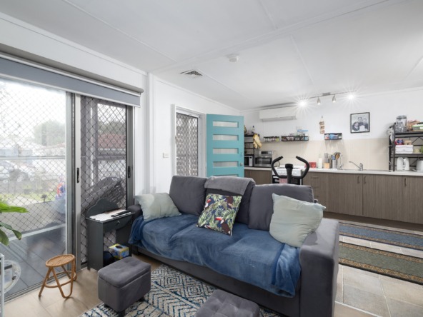 Inside, the home features an open-plan living, dining and kitchen area with split-system air conditioning, ceiling fan and plenty of natural light. The kitchen provides good bench space, storage and electric cooking, while the dining area sits separately for everyday meals. The bedroom is well-sized and includes its own air conditioning, with the bathroom/laundry combined for practical day-to-day living.