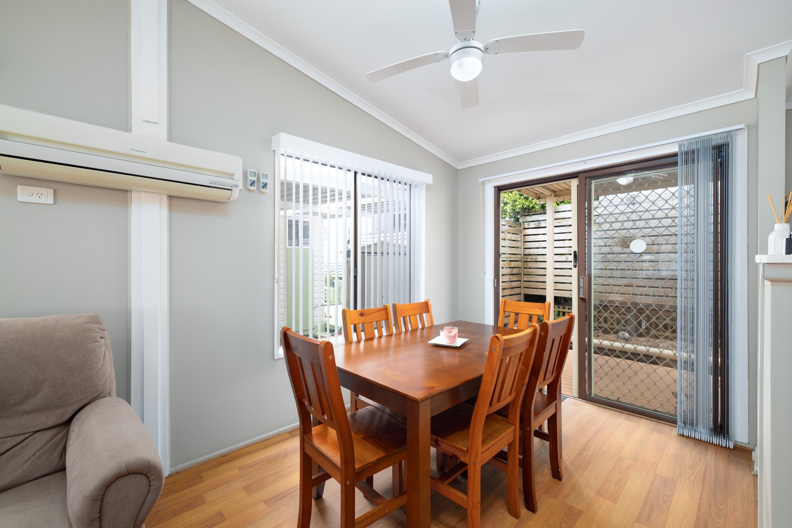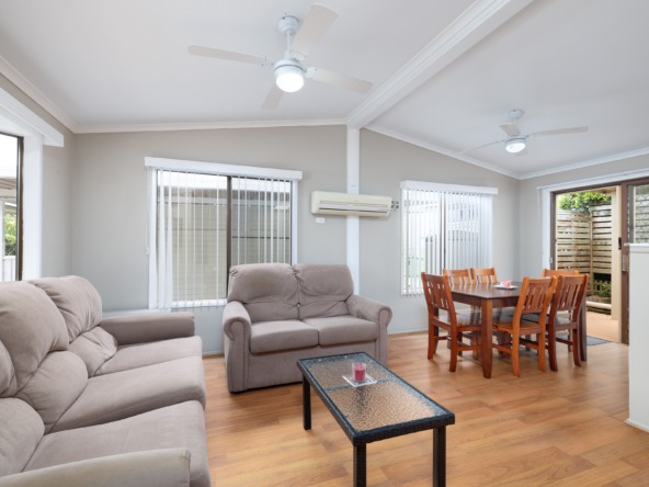 Open-plan living & dining with air-conditioning and ceiling fans